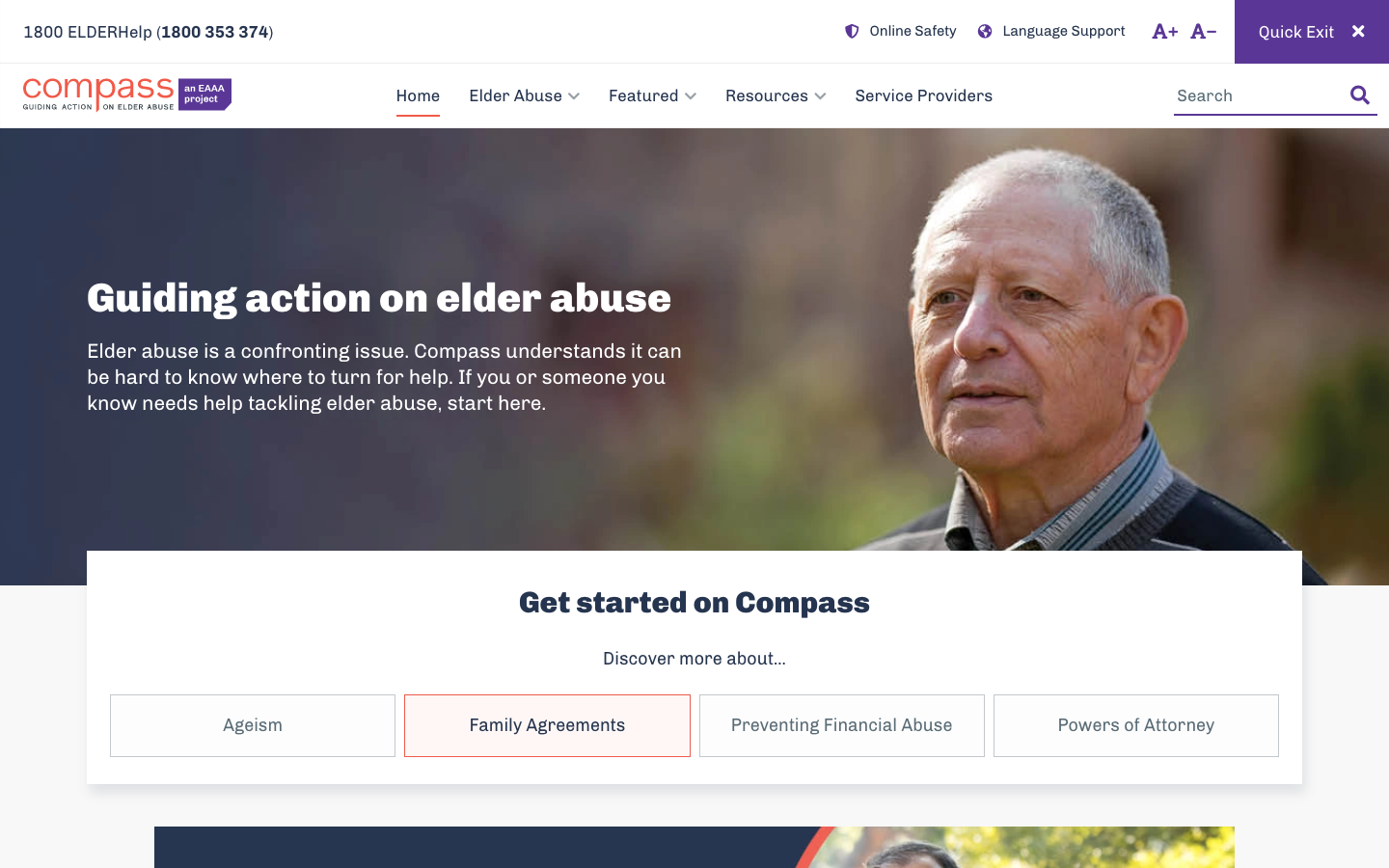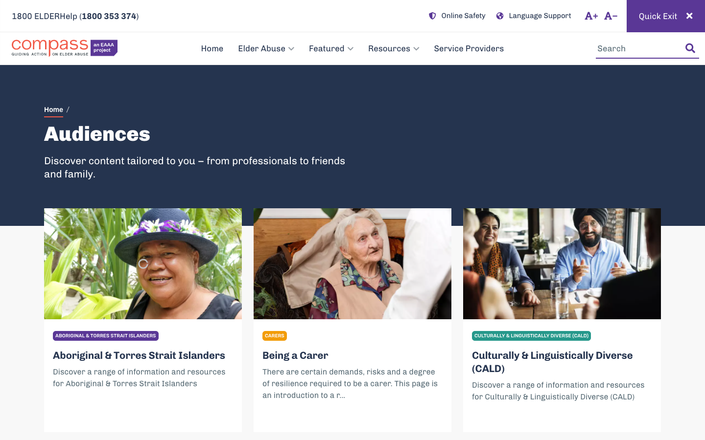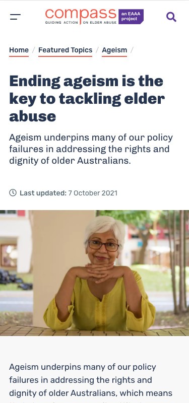 Elder Abuse Action Australia (EAAA), with funding from the Australian Government Attorney-General’s Department, approached Grade to review, redesign and ultimately rebuild the existing Compass site, which was already content heavy but proving hard for visitors to navigate, and difficult for the content team to keep updated.
