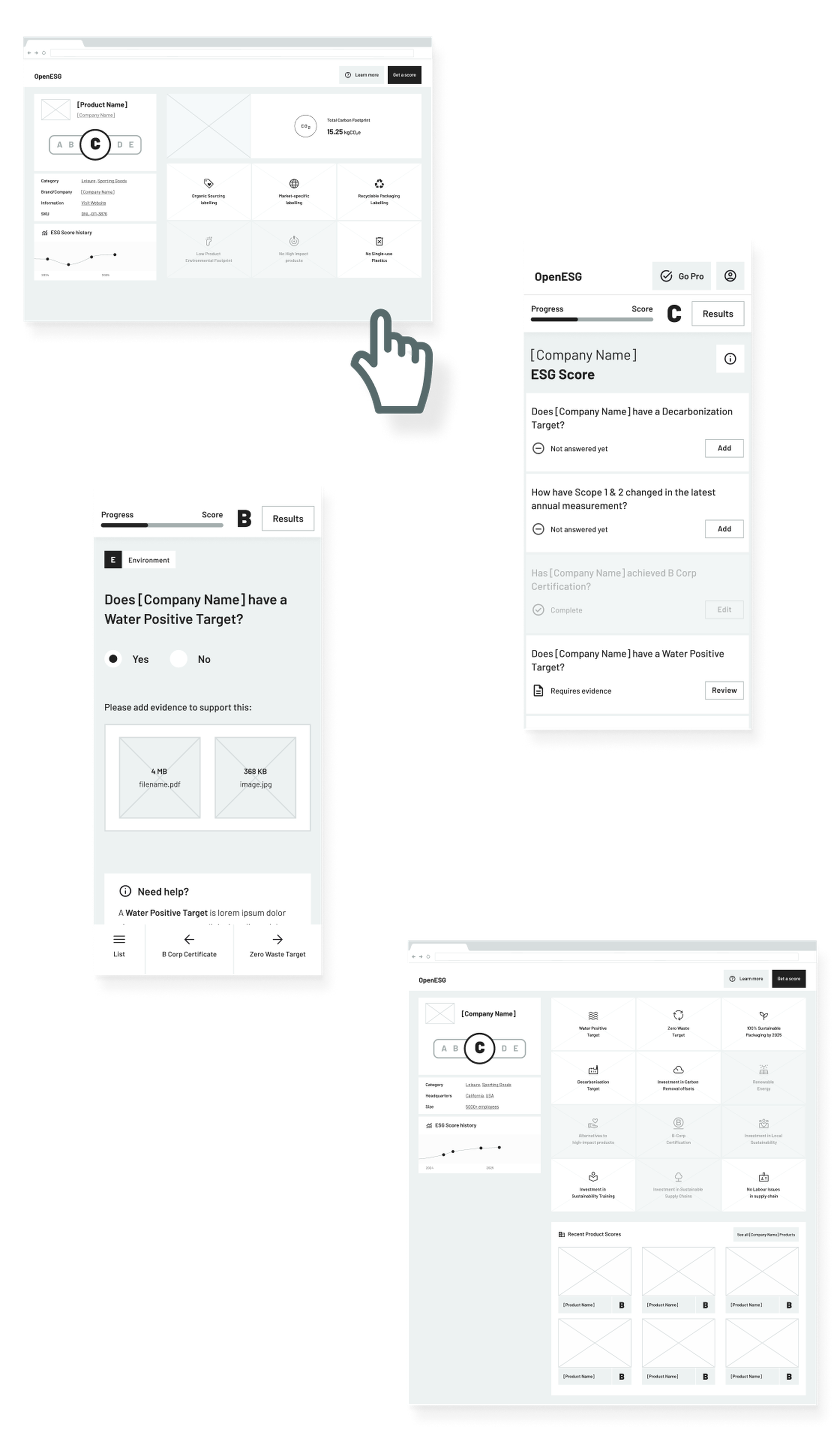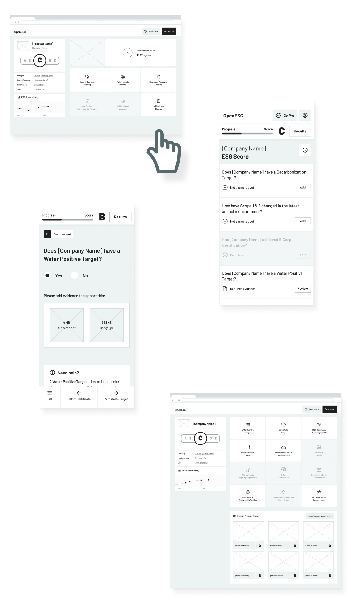 Simple yet elegant UI design allows users to intuitively create an account, complete a company and/or product ESG score, submit it for review and showcase it to consumers on their website.